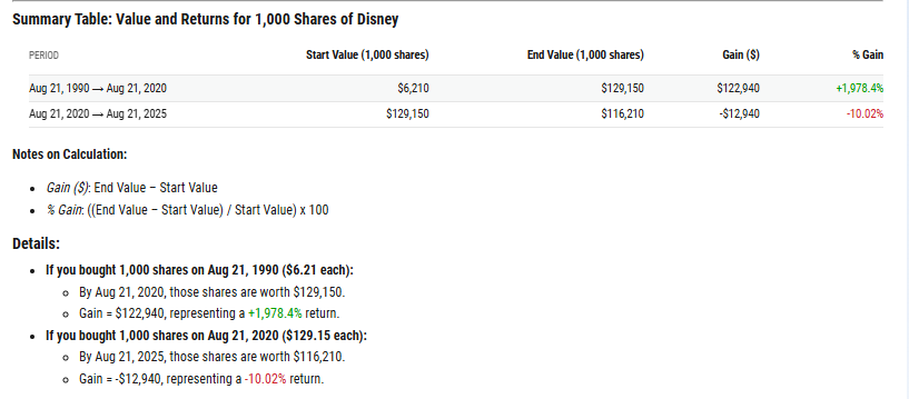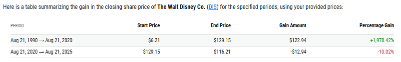 Let’s say someone bought a share of Disney on the day they were born on August 21st, 1990. Back then, the stock was valued at $6.21 a share. Tragically, this person passed away on their 30th birthday when the stock was valued at $129.15 per share. Their sister inherited the stock and her new basis is now $129.15. When the sister sells the stock five years later, the price is now $116.21, a 10.02% loss.